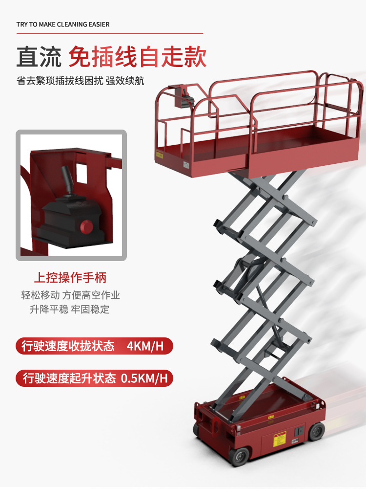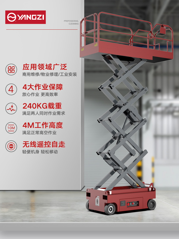 揚子升降平臺:無線自走、堅固穩(wěn)定、升降平穩(wěn)、移動方便、彈簧減震、安全環(huán)保等優(yōu)點,還有多場景使用,加長延伸站立臺,還配有應急下降按鈕