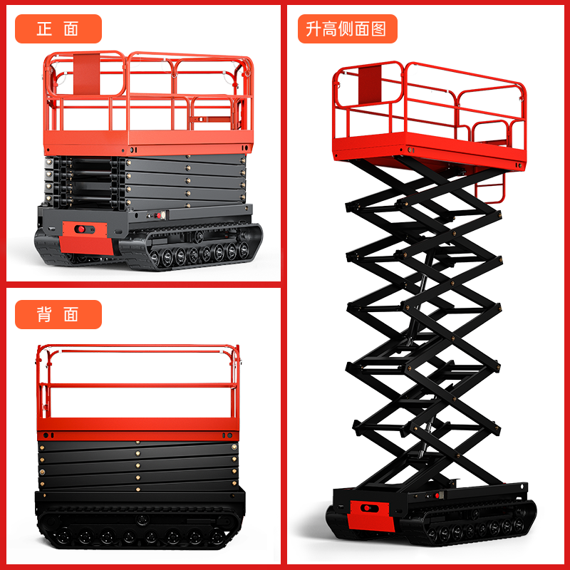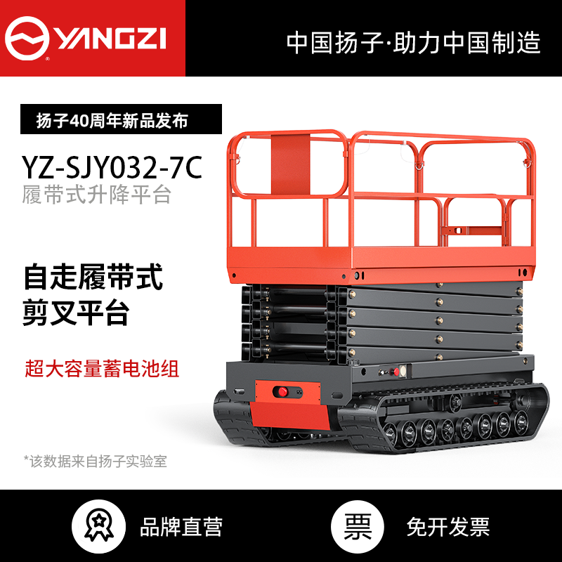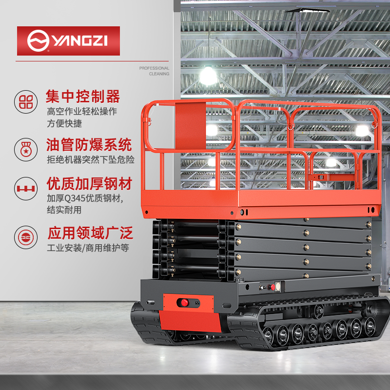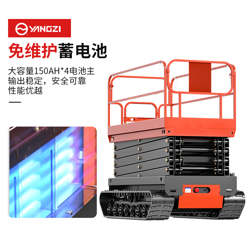 揚(yáng)子履帶式升降平臺(tái)SJY032:跋山涉水,如履平地,安全承載,加固護(hù)欄,剪叉支架Q345優(yōu)質(zhì)鋼材,坦克式底座自由靈活,操作簡單,加厚鋼材,免維護(hù)電池。