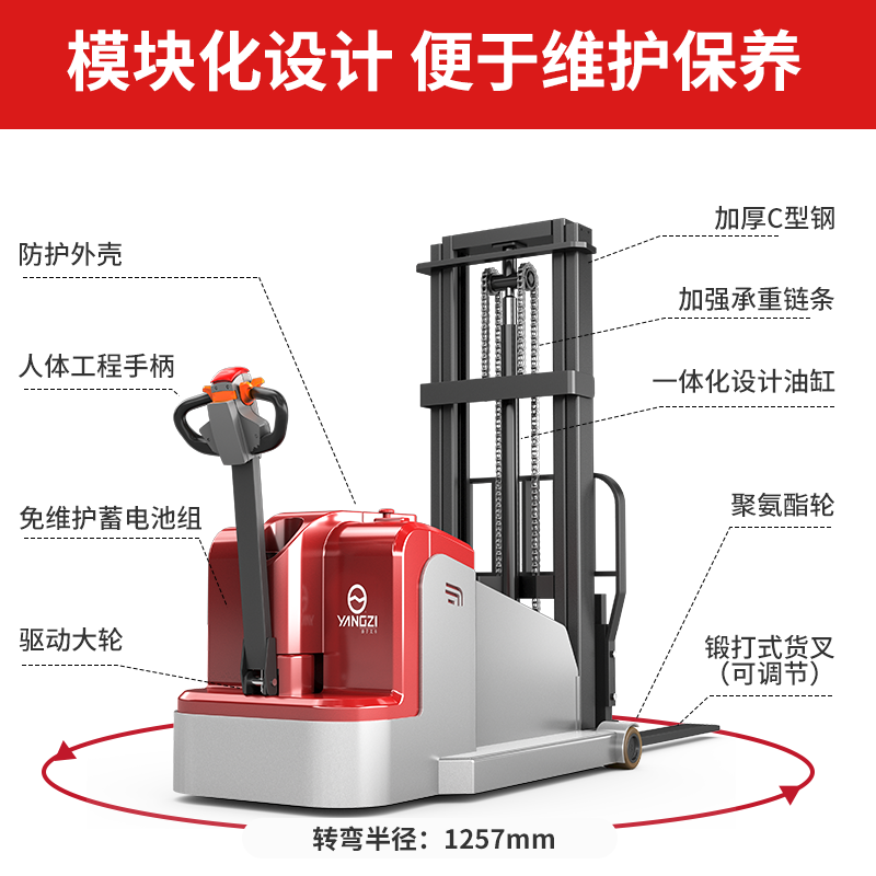 揚(yáng)子堆高車CPDB:精工鍛造有效載荷高,車身輕,強(qiáng)度高,穩(wěn)定性能好,一體鑄造油缸,載荷更大杜絕漏油。還有手動(dòng)緩降控制閥門,采用高性能免維護(hù)電池組
